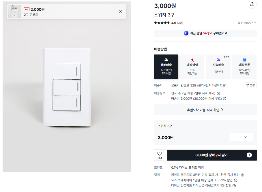 스위치가 2구인지 3구인지도 잘 확인하고 꼭 알맞는 것으로 구매하세요! 저의 경우 3구라서 3구로 구매했습니다.